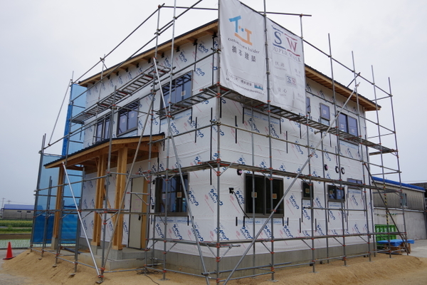 長い梅雨のおかげで外壁工事が遅れていますが、さすが職人。もうすぐ張り終えます。
